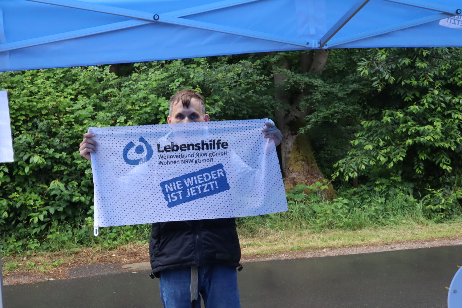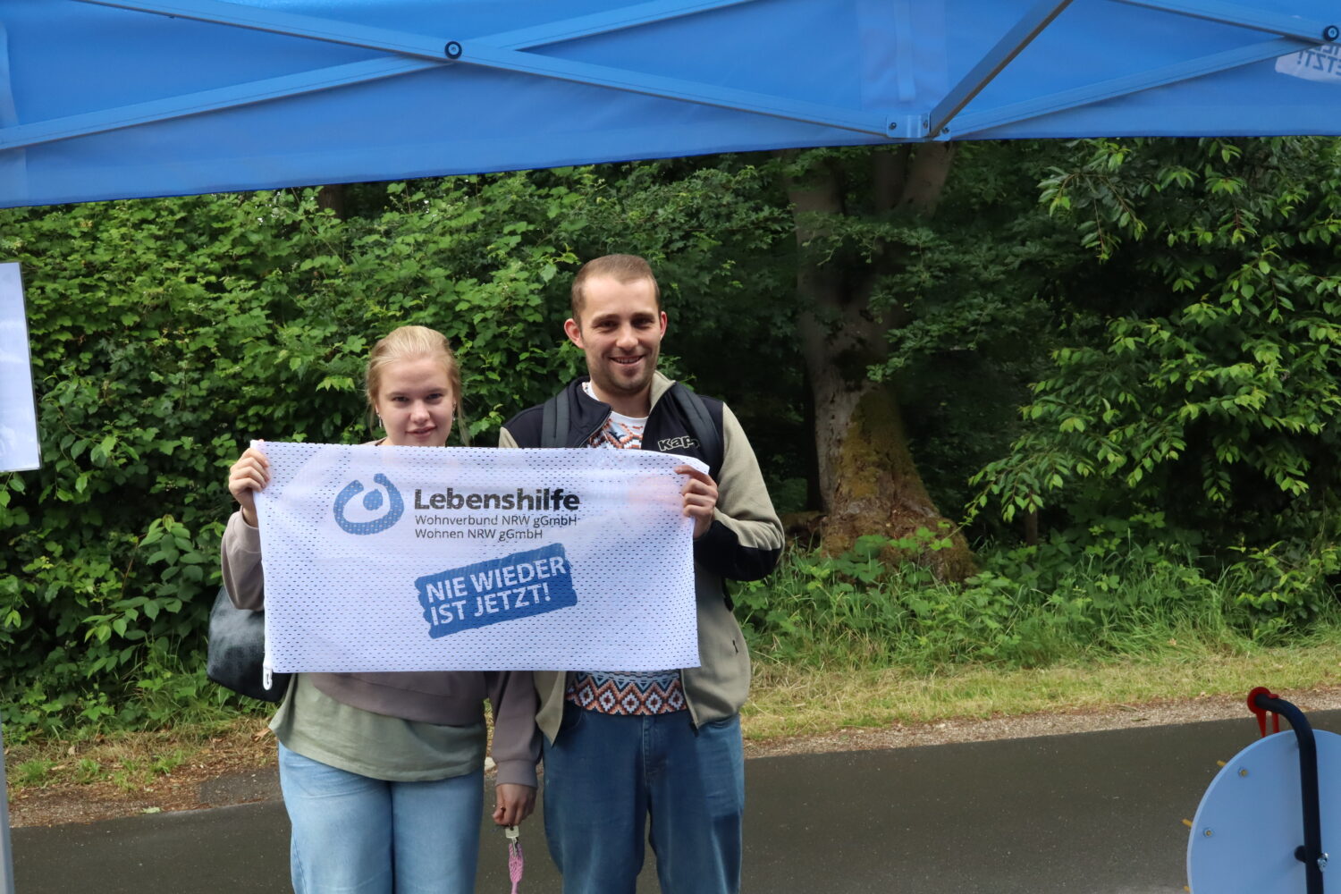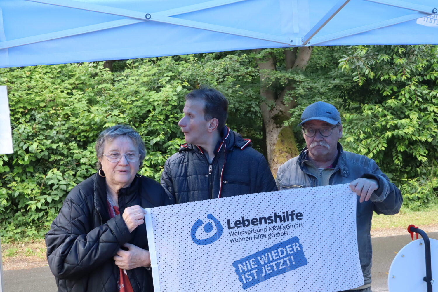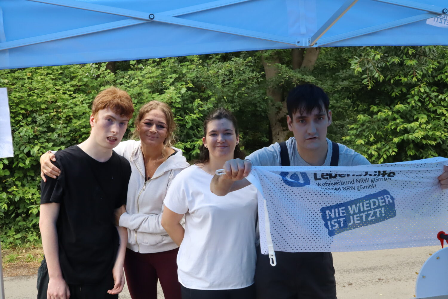 Fotobox und Glücksrad, ein reger Austausch zwischen Menschen mit und ohne Behinderungen und viele kleine Zeichen der Vielfalt und Inklusion: das alles gab es an Christi Himmelfahrt rund um den Infostand der Besonderen Wohnform „Haus Magdalana“ auf der Hinsbecker Heide. Anlass war der traditionelle „Wandertag“ im Naturpark Schwalm-Nette, der in diesem Jahr bereits zum 58. Mal mit einem bunten Rahmenprogramm über die Bühne ging. Zahlreiche Besucher:innen machten Halt am Stand der Lebenshilfe Wohnen NRW gGmbH und Lebenshilfe Wohnverbund NRW gGmbH, freuten sich über kleine Gewinne am Glücksrad und ließen sich mit der „Nie wieder ist jetzt“-Flagge ablichten. Abschließend wurden die gespeicherten Fotos zu einer großen „Collage gegen das Vergessen“ zusammengefügt.